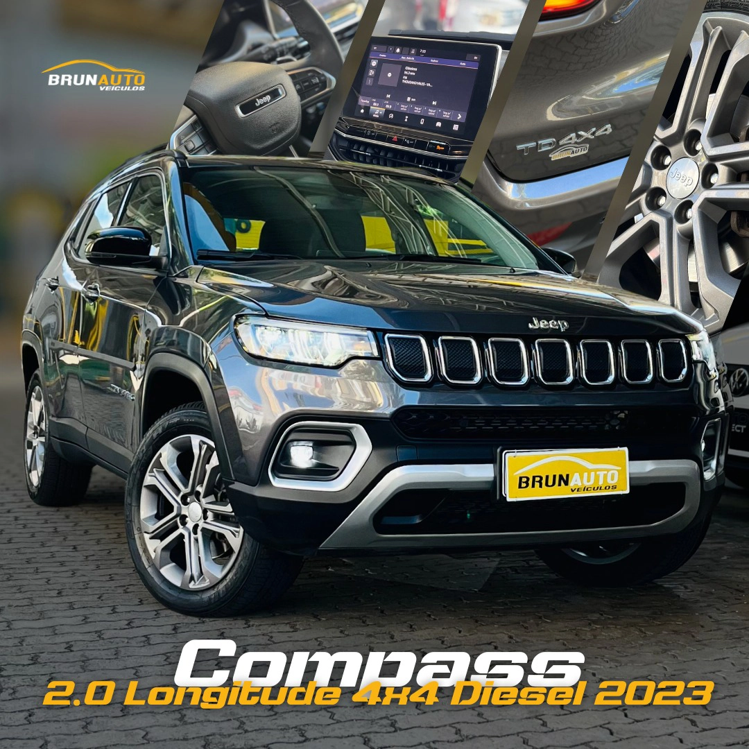 Detalhes: Jeep Compass 2.0 TD350 Turbo Diesel Longitude AT9 2023, com 40 mil km. SUV premium, potente e completo, com excelente desempenho, tração forte, conforto e tecnologia de ponta. Ideal para quem busca robustez com sofisticação. Disponível na Brunauto Veículos com garantia total. Venha conferir!